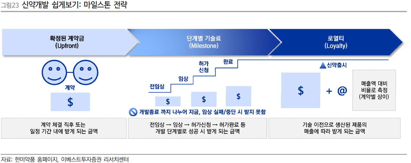 이 모든 단계를 뚫고 신약 후보물질 단계에서 신약이 될 확률은 0.01%, 1상에서부터 승인이 될 확률은 9.5%다. 이처럼 신약개발 과정은 비용, 시간도 많이 드는데, 성공률도 매우 낮아서 정말 하이리스크 - 하이리턴 사업이다. 이런 리스크를 탈피하고 안정적인 개발사업을 진행하고자 최근 국내외 제약사들은 글로벌 빅파마들과 '라이선스 아웃(기술수출)' 계약을 맺는 경우가 많아졌다.