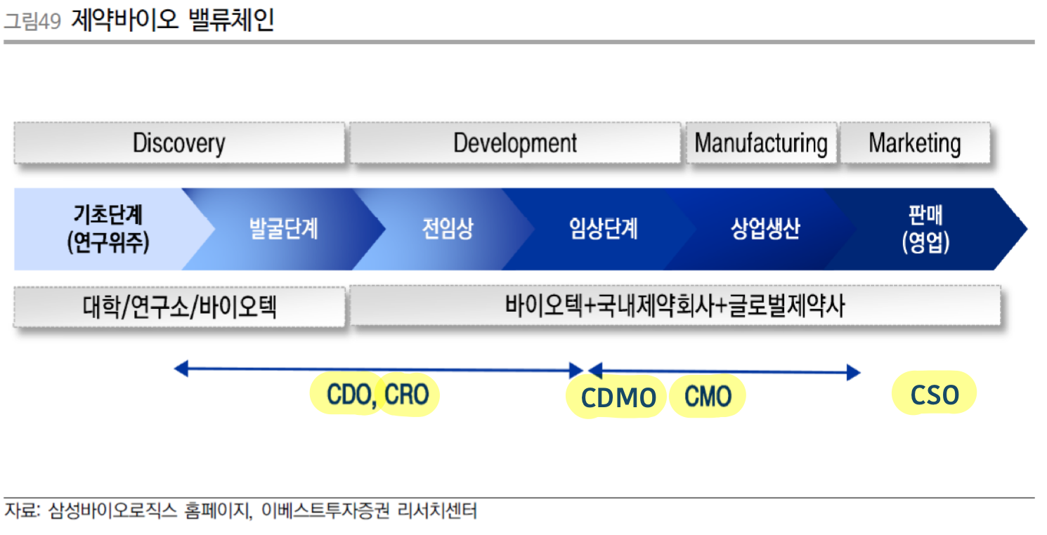 제약 바이오산업의 밸류체인은 연구 - 개발 - 생산 - 판매의 단계를 거치며, 이 과정들이 세분하게 분업화되어있다. 각 과정에 필요한 생산 시설과 설비가 다 다르기 때문에 한 회사가 모든 걸 하는 경우는 잘 없고 보통 내가 1을 하면 2는 다른 회사에 위탁하는 그런 방식을 취하고 있다. 그래서 위탁 산업이 주를 이루고 있는데 위탁 단계는 개발단계부터 판매까지 차례대로 CDO, CRO, CDMO, CMO, CSO로 세분화된다.