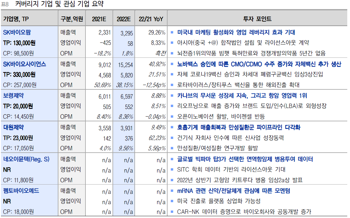 - 자회사 SK라이프사이언스가 미국 내 영업을 하고 있어 대면영업 확대 리오프닝 수혜를 받을 것으로 예상. 세노바메이트도 미국 리오프닝에 맞춰 점차 영업이익이 잡히기 시작할 것으로 전망.