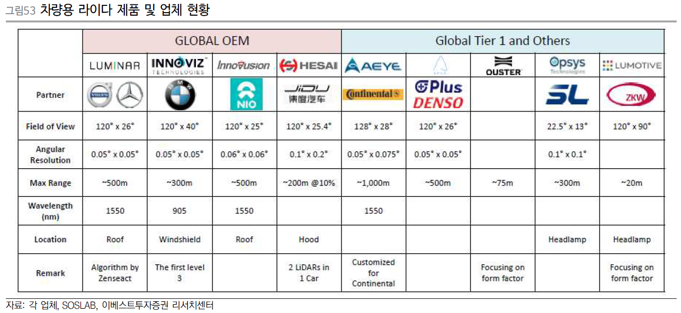 라이다 시장은 미국(Velodyne/Luminar)과 유럽(Valeo, Innoviz) 업체가 주도하는 가운데 각국의 완성차 OEM과 주요 Tier 1 업체들과의 협업을 강화하고 있다.